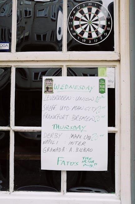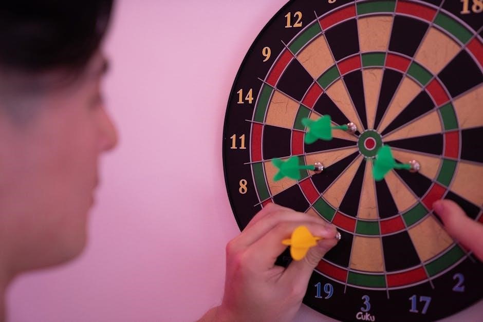 Scoring Multipliers: Darts landing in the double ring double the segment’s value‚ while the triple ring triples it. Accurate aiming is crucial for maximizing points.